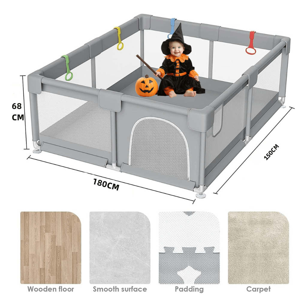 The playpen measures 120cmx120cm and 150cmx180cm, providing a spacious area for your child to play and move around comfortably.