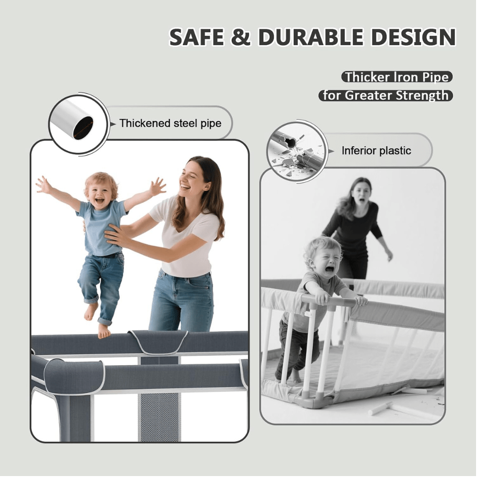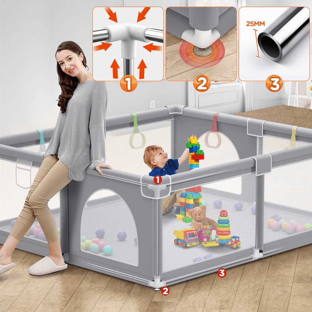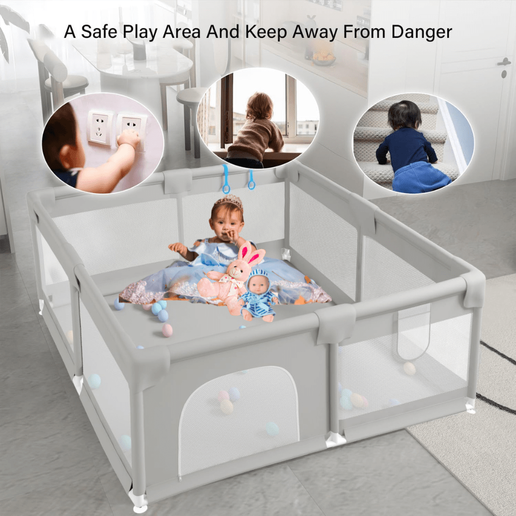 Safety First: A playpen provides a safe and secure space for your baby to explore and play, especially as they become more mobile. It’s designed to keep them away from household hazards like stairs, sharp objects, or pets. For parents, it offers peace of mind while you multitask, knowing that your baby is safe within sight.Developmental Benefits: The enclosed space of a playpen offers a perfect environment for your baby to practice physical skills like crawling, standing, or walking without the risk of falling into dangerous areas. As they explore, they develop hand-eye coordination and strength, laying the foundation for more advanced milestones.