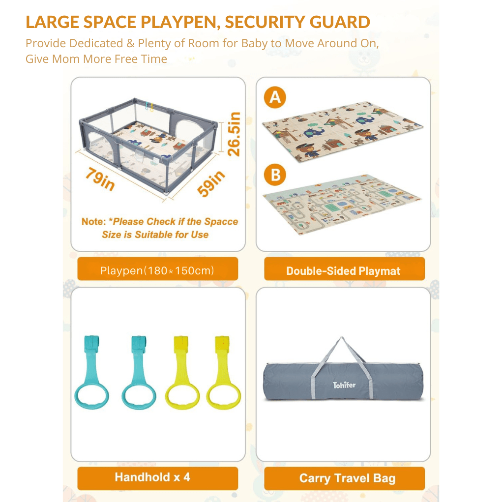 - ✨ EASEFUL USE AND COPACT TO CARRY: Baby play yard offers an enclosed area that is secure and safe for babies and young children to have fun in. Playing inside baby playground helps to protect them while giving parents peace of mind. Playpen baby provides convenience in terms of portability and storage, Play pen for baby is easy to assemble and disassemble without the need for any tools. It only takes a few seconds to be joined and taken off which is ideal solution for busy parents.