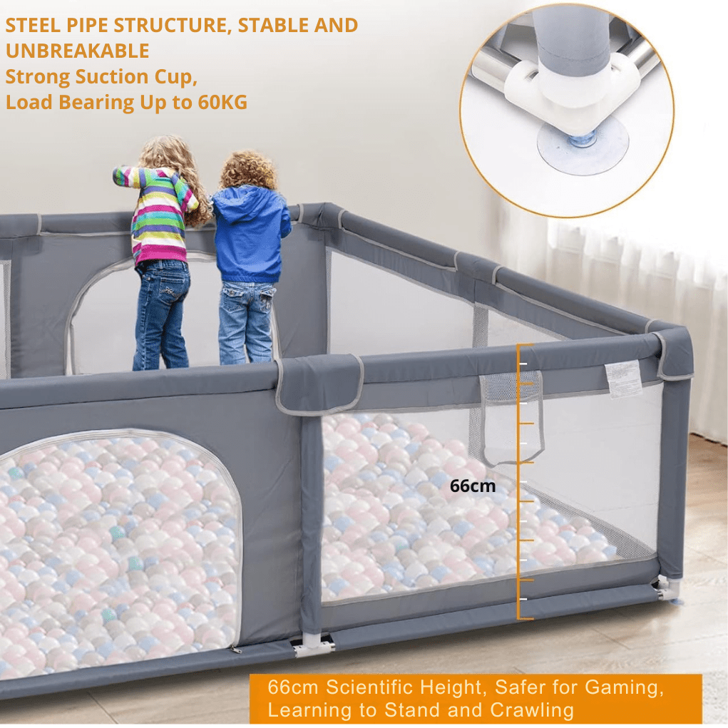 The playpen measures 120cmx120cm and 150cmx180cm, providing a spacious area for your child to play and move around comfortably.
